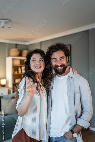 Happy couple showing their new home, smiling and gesturing inside modern apartment