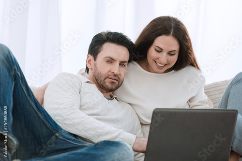 happy couple sitting on the couch in her arms, looking at laptop