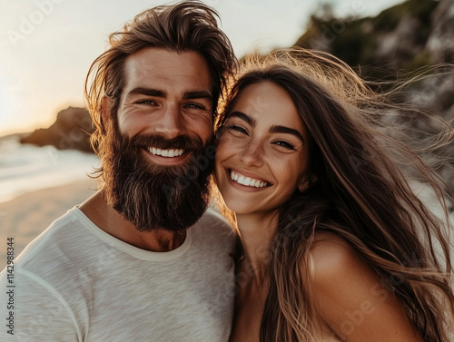 Happy Couple Smiling and Embracing on a Beach at Sunset with Wind-Blown Hair