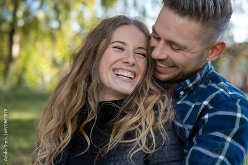 Happy couple smiling and embracing outdoors in nature – Love and romance