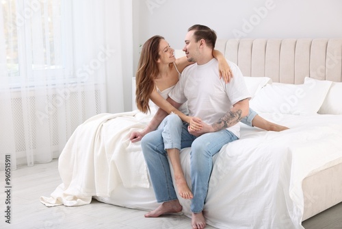 Happy couple spending time together on bed at home