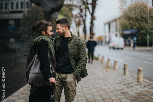 Happy couple standing on a city sidewalk sharing a joyful moment during daytime.