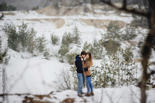 Happy couple walking on the snowy winter nature. Happy boy and girl. Happy holidays. Merry christmas and happy new year concept.