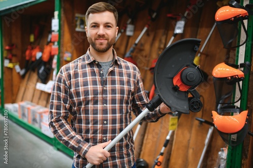 happy customer with electric lawn trimmer in hands at garden equipment store