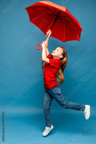 Happy cute little blonde hair child girl in red t-shirt holds in her hands red umbrella on a blue background in studio. childhood, autumn, spring concept, space for text
