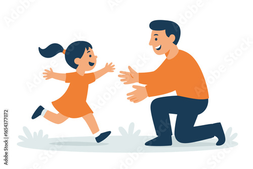Happy daughter running to her father's loving arms. Father's Day family reunion concept. Parent and child meeting outdoors for a hug. Parenthood joy cartoon vector illustration.