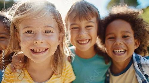 Happy diverse group of children smiling and looking at the camera. They are outdoors on a sunny day.