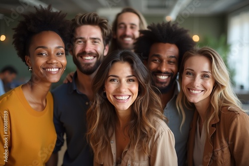 Happy diverse group of young professionals smiling and posing together in a modern office setting