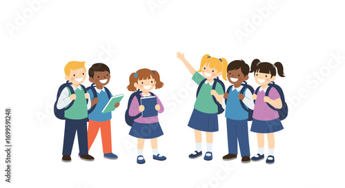 Happy diverse students with backpacks ready for a day of learning and friendship together