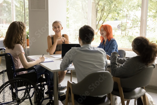 Happy diverse team of students inclusively girl with disability meeting in campus library, sitting at table in library, talking, doing homework, enjoying education, teamwork, communication