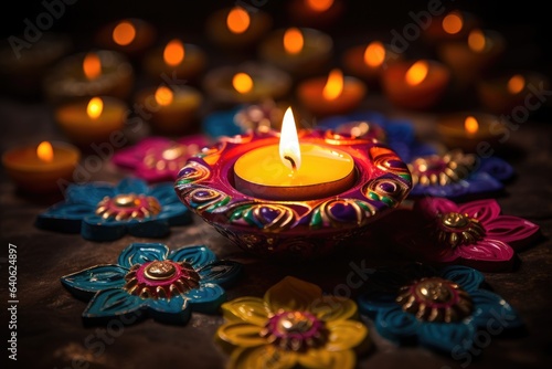 Happy Diwali. Clay Diya lamps during Diwali celebration, Hindu festival of lights celebration.