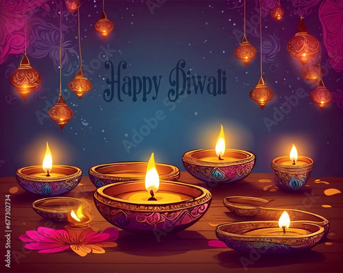 Happy Diwali illustration Of Burning Diya On Happy Diwali, Traditional Indian oil lamps, Diwali Celebration Festival Of Lights With Ai generate Background
