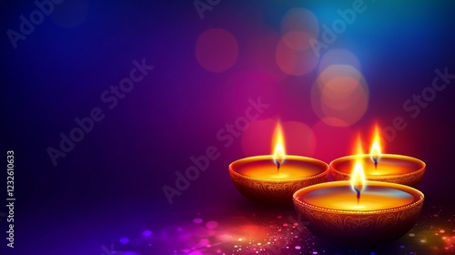 Happy Diwali Lighting diya oil lamps against a bokeh blue and pink backdrop