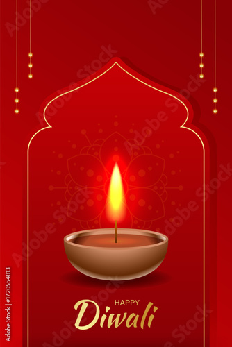 Happy Diwali vertical poster with diya lamp and mandala pattern. Traditional Indian festival of lights Shubh Deepavali. Vector illustration for celebration and culture themes