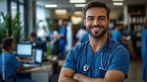 Happy Doctor with Stethoscope in Medical Office. Cheerful doctor with a stethoscope smiles in a bright medical office, representing professionalism and excellent healthcare services.