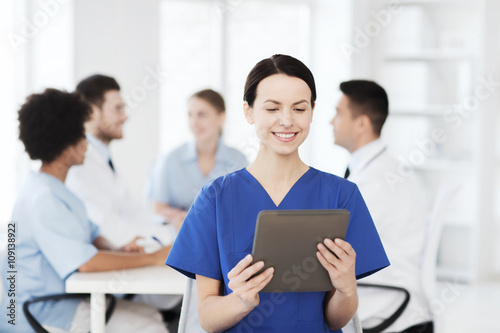 happy doctor with tablet pc over team at clinic