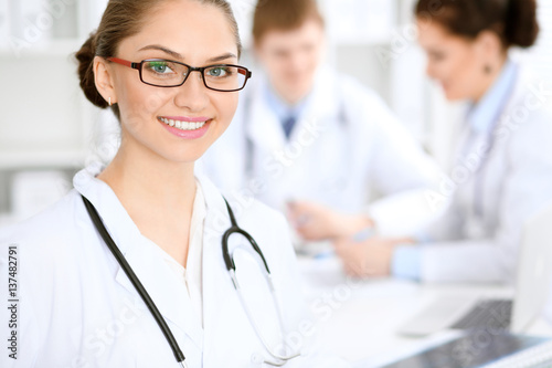 Happy doctor woman with medical staff at the hospital sitting at the table and discussing medical history