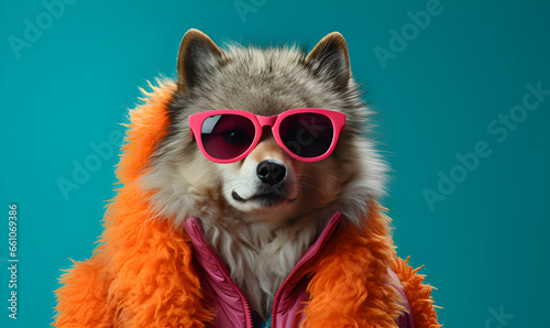 Happy dog character in two tone stylish sunglasses and fur coat looking away against pastel and turquoise background.
