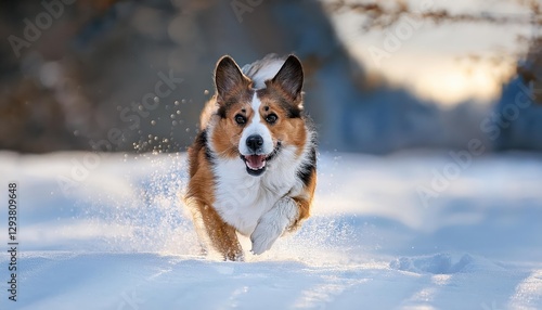 Happy Dog Dashing through Snowy Winter Landscape A Joyful Portrait of Canine Exuberance Amidst Frosty Tranquility and Vibrant Winter Colors