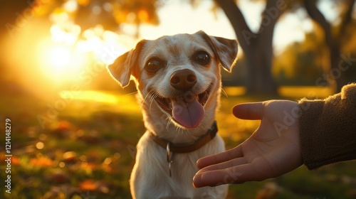 Happy Dog Greeting Person in Autumn Park at Golden Hour Light