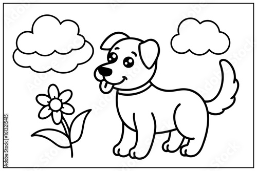 Happy Dog In A Field With A Flower And Clouds A Cute Coloring Page For Kids