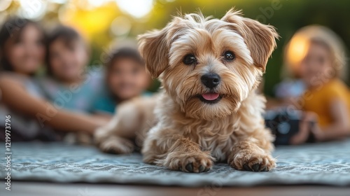 Happy dog with family, outdoor picnic, sunset