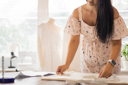 Happy dressmaker female use sewing patterns and measuring tape for creating fashion clothes