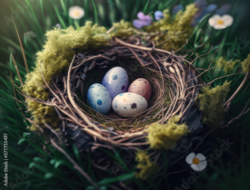 Happy Easter background concept with easter eggs in nest and spring flowers created with Generative AI technology