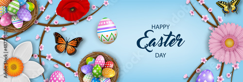 Happy easter background with decorated eggs in the nest, flowers and butterflies