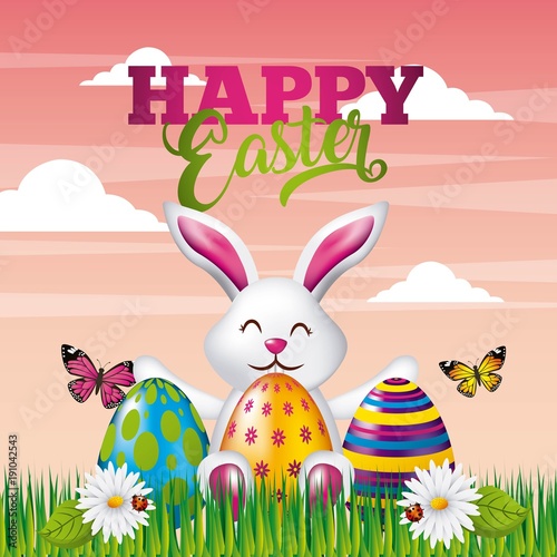 happy easter card cute bunny colored eggs butterfly flowers and landscape vector illustration