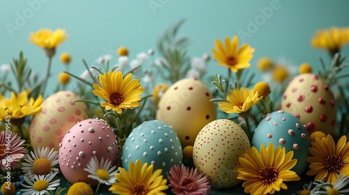 happy easter card template flat lay composition with colorful easter eggs and yellow spring flowers on green background.stock image