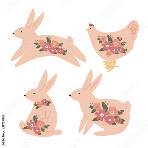 Happy Easter clipart set, Cute bunny rabbit illustration, Childrens egg hunts clip art, Individual elements, Spring vector images in flat cartoon style, Easter basket, chick, spring, flower.