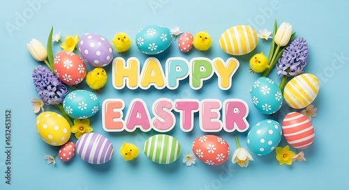 Happy Easter colorful eggs and cute chicks decorations
