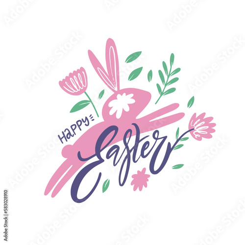 Happy Easter colorful text lettering style and bunny or rabbit pink color vector illustration.