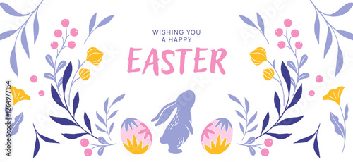 Happy Easter greeting card in trendy design with typography, decorative eggs, floral elements, and Easter bunny. Modern art style. Template for postcard, invitation, promo, ads poster