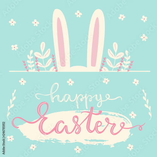 Happy Easter hand written lettering words and cute floral adorable banner with flowers, eggs, leaves and hand drawn textures on background