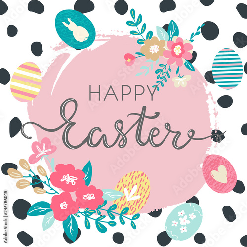 Happy Easter hand written lettering words and cute floral adorable banner with flowers, eggs, leaves and hand drawn textures on background