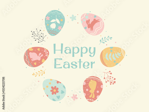 Happy Easter simple poster with colored eggs and branches, pastel colored postcard