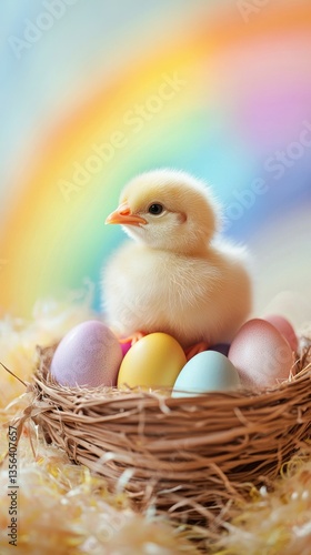 Happy Easter Sunday background, A collection of pastel-colored Easter eggs placed in a wooden basket, surrounded by soft, fluffy chicks, with a colorful rainbow in the background, playful,