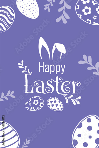 Happy Easter Vector Creative Greeting Card or Banner Design. Decorated Easter Eggs, Bunny Ears, Spring Flowers and Plants decorations. Painted and Ornamental Eggs. Creative Easter and Spring Frame.