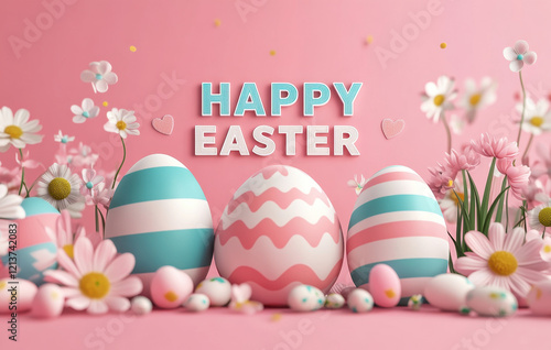 Happy Easter with colorful striped eggs, flowers, and cheerful pink background creates festive atmosphere. Celebrate joy of spring and renewal