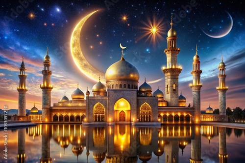 Happy Eid Al Fitr Celebration with Gold Moon and Mosque Background for Festive Designs