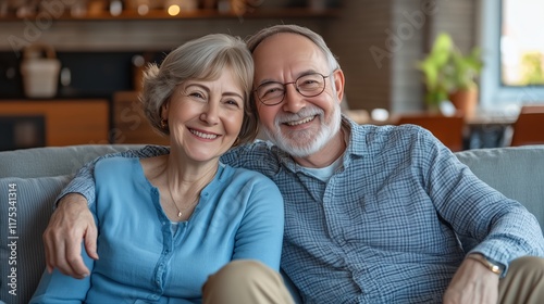 Happy elderly couple enjoying a cozy moment together at home during a sunny afternoon