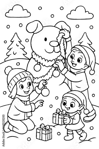 Happy Elves Building a Snowman, Decorating a Christmas Tree, and Having a Snowball Fight - Fun Coloring Page