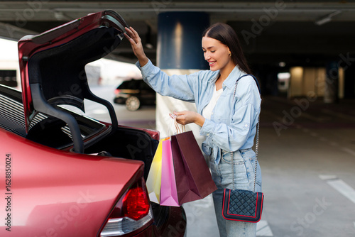 Happy European lady putting her paper shopping bags into the car trunk, ready to go home from city mall after successful shopping, side view