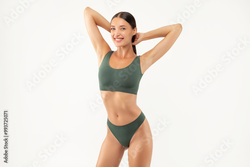 Happy European woman in green lingerie posing with hands behind head and smiling at camera over white studio background, showing smooth armpits and slender body shape