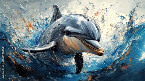 Happy face of a dolphin peeking above water, splashes and blue tones