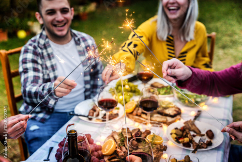 Happy family celebrating with fireworks at barbecue backyard party - Young people having fun with fire sparklers at night time - Friends celebrating new year event together