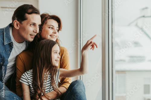 Happy family curiously looking at home window