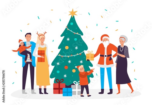 Happy family decorates Christmas tree. Holiday decorations and xmas garlands, people decorating 2020 New Year tree. Family characters greeting celebration card isolated vector illustration